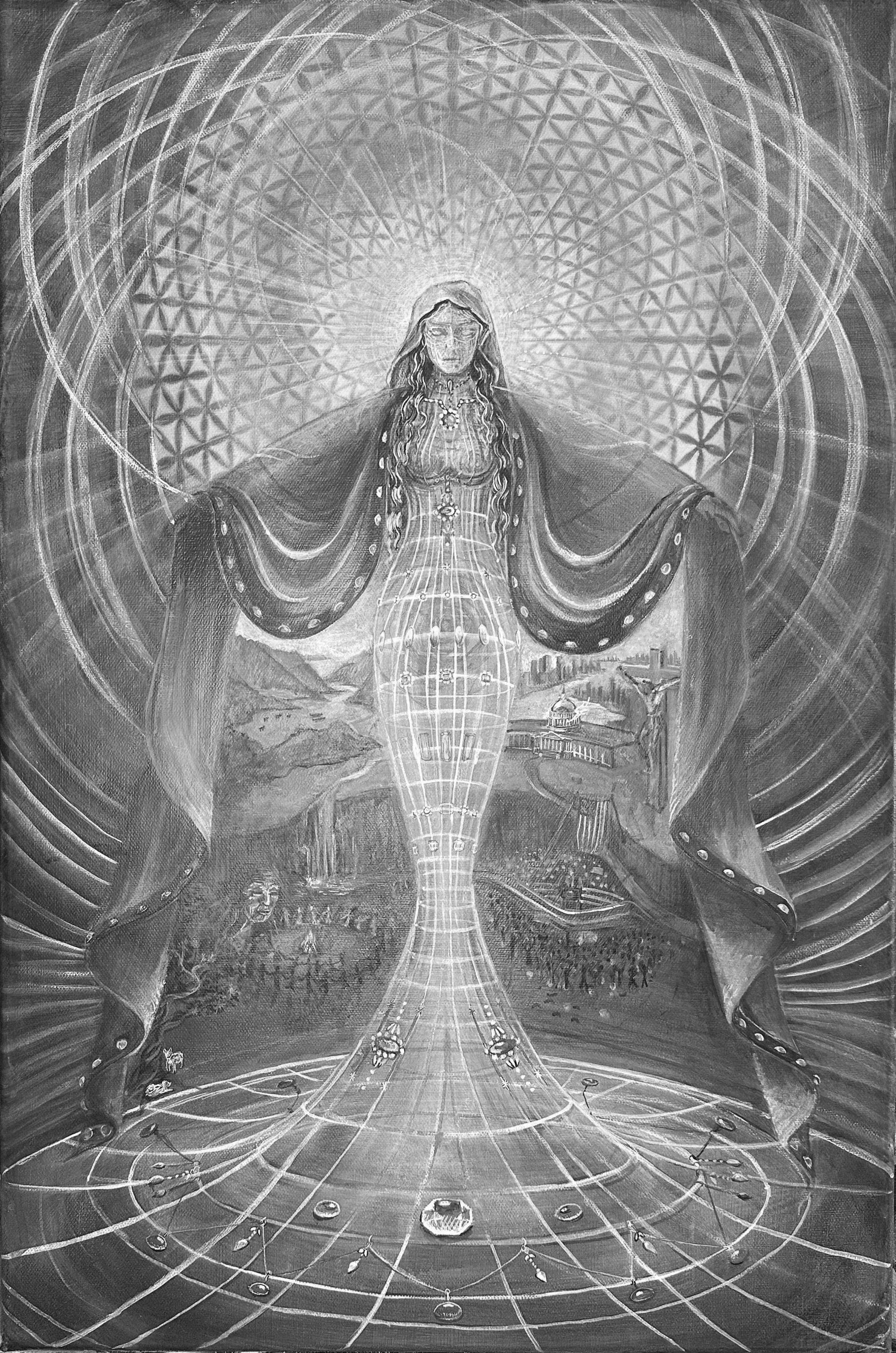 In 2018, I received the first vision of a painting while my mom was battling cancer, an image expressing the eternal nature of the Mother. In 2023 I received the second, a warning of a violent incident that would soon come. By the end of 2024, after witnessing a condensed series of miracles, and profound loss, I surrendered— and devoted my life to what I know as my higher calling. Now, each vision is a mission, a message I get to birth onto the canvas and share with the world—-